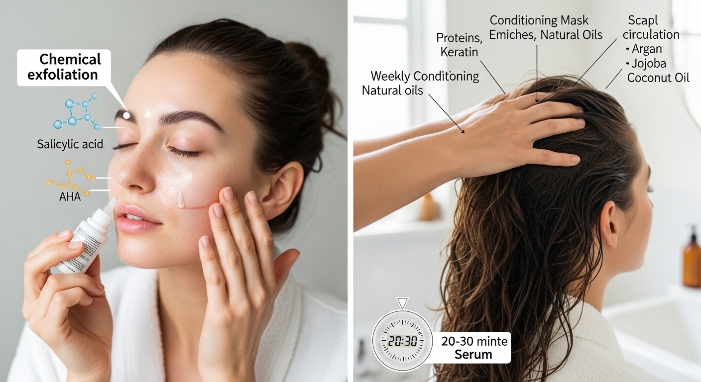 Keep on your morning and evening routine. In the case of the best results, other interventions, which are done weekly or twice a week, such as masks, hair treatments, or soft exfoliation, can be added.