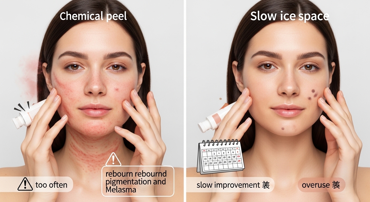 Recovery of the skin is time-consuming. There is hyper peeling of the skin that leads to a weak skin, and pigmentation.