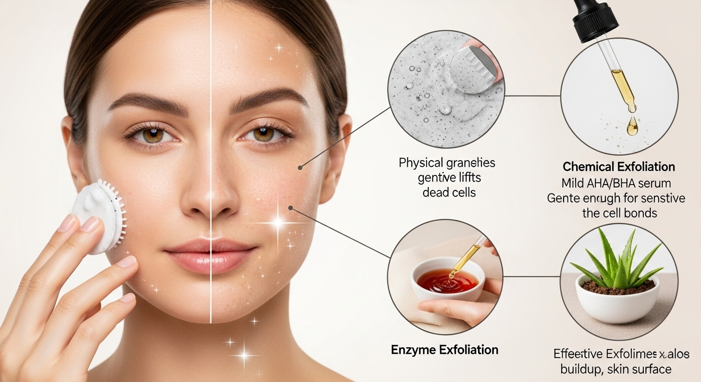 The use of acid like AHA or BHA is utilized in chemical exfoliation. These solubilize the glue that holds dead cells. This procedure offers painless smooth outcomes. It fits well in the roughness and obstructed pores. Over use results in burning and peeling. Slow use keeps skin safe.