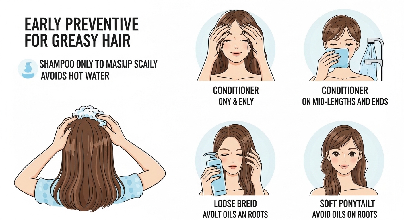 Do not apply roots with oils or serums. Ponytails or loose braid hairstyles can be used to deal with oil. Avoid excessive brushing since this coats the hair shaft with oil.
