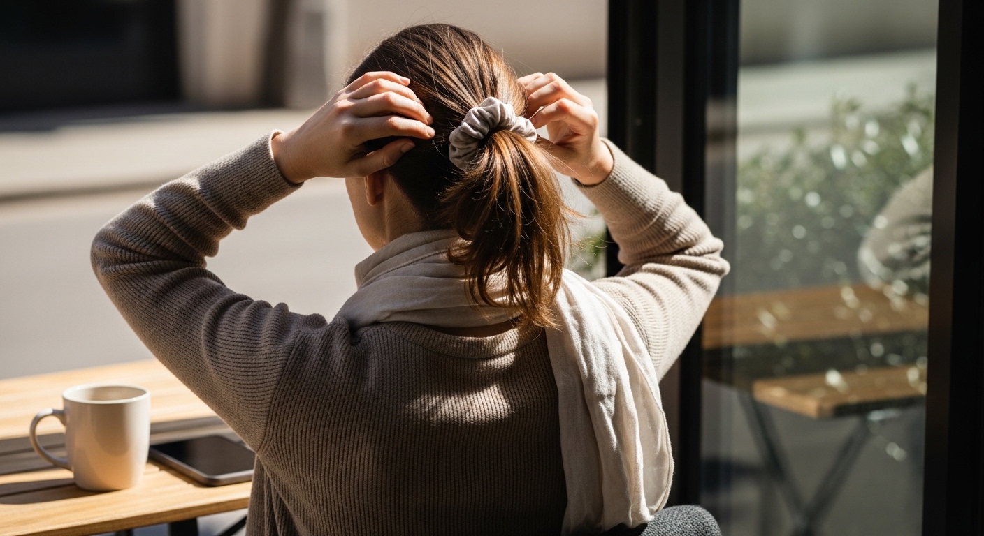 Stress control (low level) in the morning should be achieved by styling. One can use clips, wraps of hair or soft fabric holds to set hair without it straining at the roots. Tight elastics are not supposed to be used and stretched at the hairline as over time tension can lead to loss and tearing.
