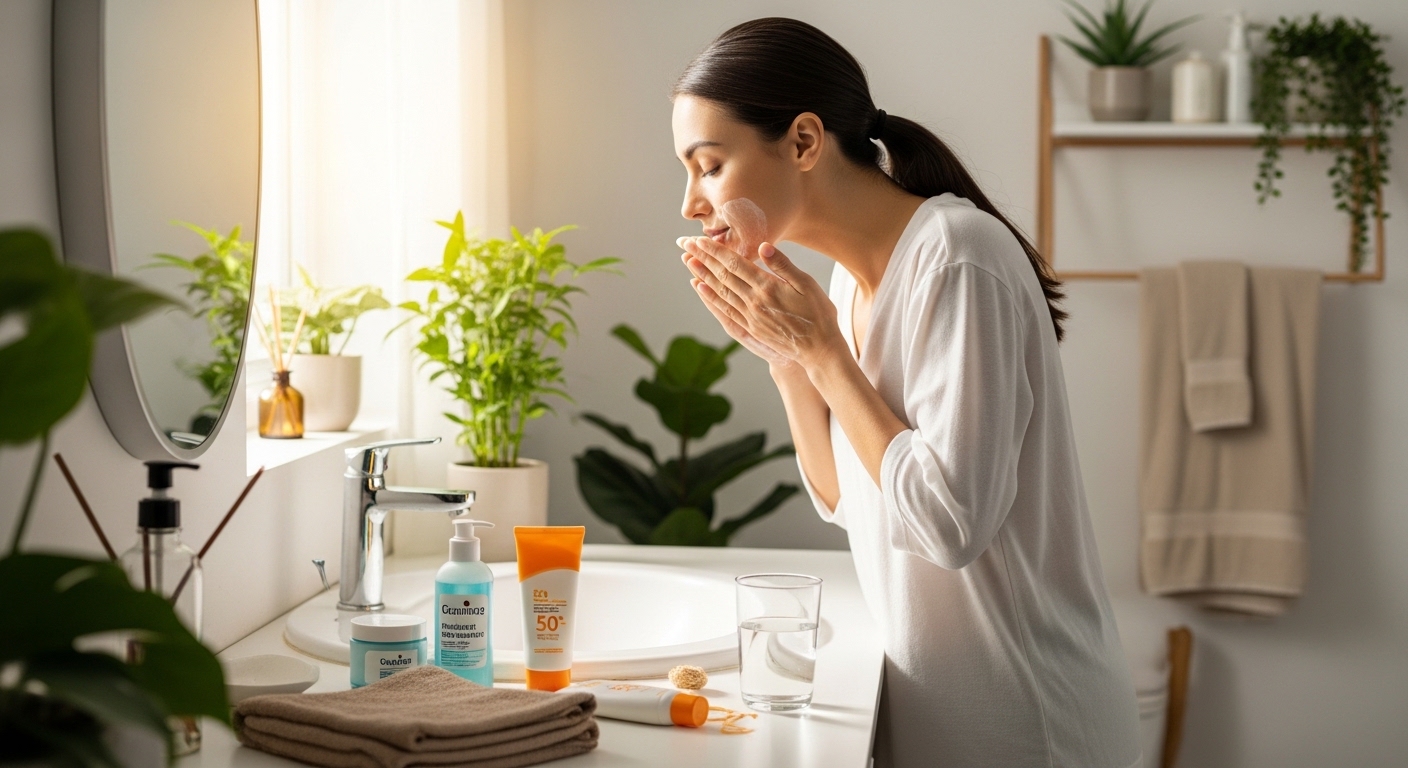Start with a gentle cleanser to remove overnight oils. Follow with a hydrating toner or serum and apply moisturizer to maintain hydration. Finish with sunscreen to protect the skin throughout the day.