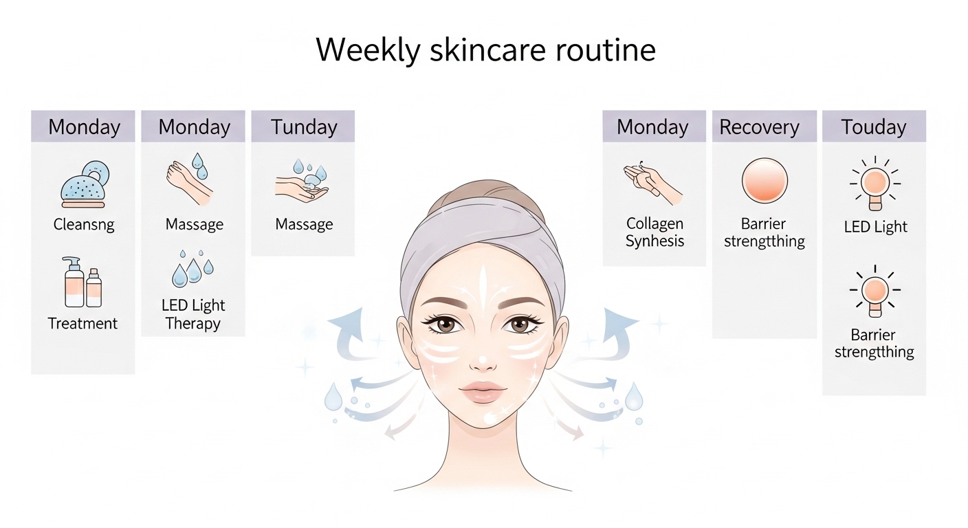 To attain improved skin texture is not so much of a marathon as a planned, organized program. The stimulation and recovery can be balanced on the basis of a weekly schedule. To illustrate this: the series of cleansing-massage-light therapy will ensure that your skin is the subject of care and rest.